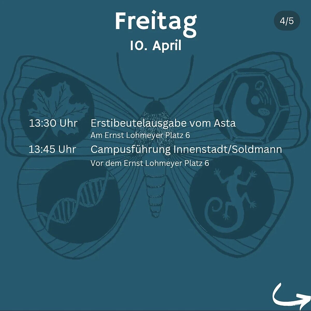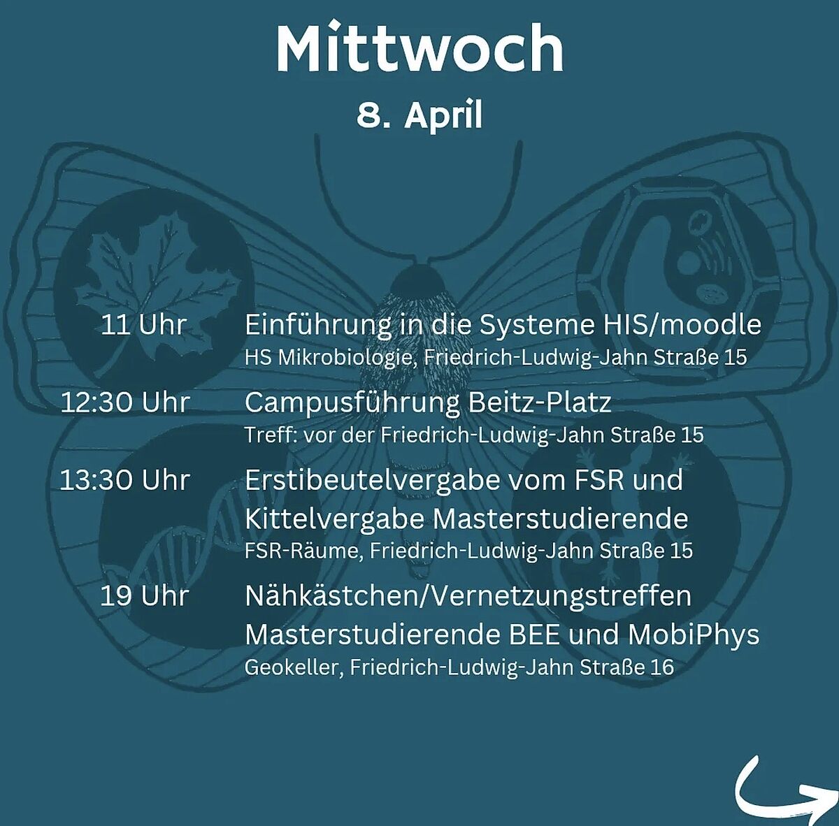 Website mit weiteren Informationen zum Programm:https://biologie.uni-greifswald.de/fachschaftsrat-biowissenschaften/erstsemesterinfo/