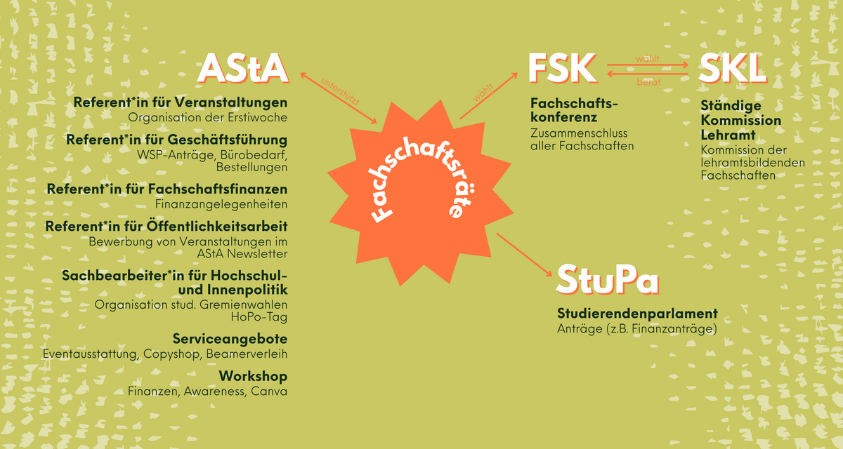 Die Fachschaftsräte vertreten die Interessen ihrer jeweiligen Fachschaft. Sie sind das Bindeglied von den Studierenden zu den Lehrenden Ihres Institutes und vice versa. Als Mitglied im FSR hast Du die Möglichkeit, Dich in eine Vielzahl von interessanten und abwechslungsreichen Aufgaben zu involvieren. Die Referate eines FSR reichen von der Organisation von fachlichen Veranstaltungen, Partys sowie der Erstsemesterwoche bis hin zu den Referaten Öffentlichkeitsarbeit, Studium & Lehre, Finanzen sowie Vorsitz. Als Mitglied in einem dynamischen Team gewinnst Du zahlreiche Einblicke in die Abläufe Deiner Fakultät sowohl als auch der gesamten Universität und hast die Möglichkeit viele Kontakte, z.B. zu Lehrenden oder anderen studentischen Gremien (AStA, StuPa, Senat, Fakultätsräte), zu knüpfen. An unserer Universität gibt es vom FSR Anglistik bis zum FSR Zahnmedizin eine Vielzahl von Fachschaftsräten. Diese treffen sich einmal monatlich auf der Fachschaftskonferenz (FSK), sowie der Ständigen Kommission Lehramt (SKL), um über Themen zu sprechen und abzustimmen, die für alle Fachschaften respektive Studierenden von Belang sind. Die sich dort ergeben Meinungsbilder haben natürlich ein hohes Gewicht, da die Fachschaftsräte am besten über die Belange der Studierenden Bescheid wissen. Du hast also als Mitglied im FSR die Möglichkeit, das Geschehen an Deiner Fakultät und auch in der gesamten Hochschulpolitik aktiv mitzugestalten. Darüber hinaus ist Dein Engagement im FSR eine hervorragende Möglichkeit, Deine Kompetenzen und Deine Persönlichkeit weiterzuentwickeln. Die Mitglieder des FSR werden in hochschulpolitischen Wahlen zu Beginn jeden Jahres von der Studierendenschaft gewählt.